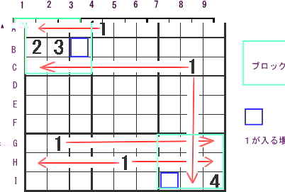 | 1、数字が見つかったら、縦横に同じ数字がないか確認しあればそれを活用して展開する | ||||||||||