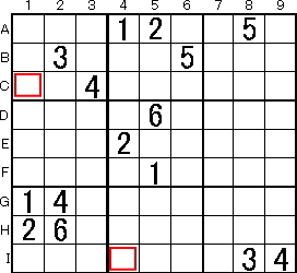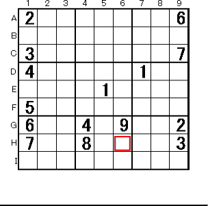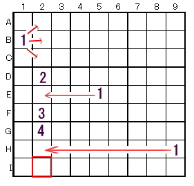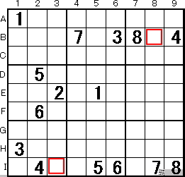 | 列9行9合計18枠毎に1つずつ1から9まで確定できる数字がないか「列見、行見」をします。 列2に1の入る場所を探します。 ブロック内に既に1があるのでA2、B2、C3には1は入らず、E2H2には同じ行内に1があり1は入らないので残りのI2に入る。 |