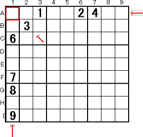 | 81個ある各マスには、同じブロック、同じ列、同じ行内にある数字は入らない。A1の「マス見」をしてみよう。 A1を見ると行に1、2、4、列に6、7、8、9、マス内に3が既に入っている。残りは5しかないのでA1=5となる。、 |