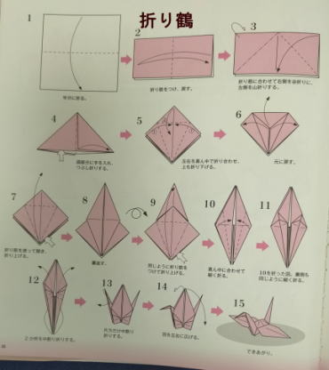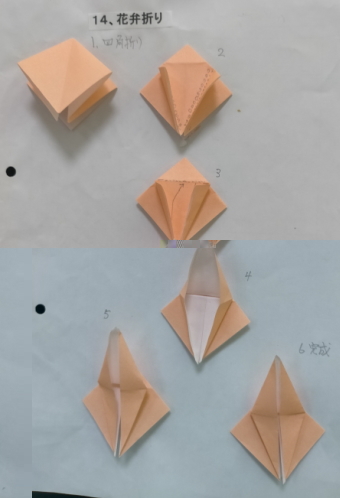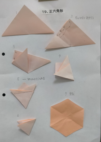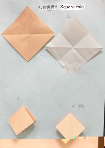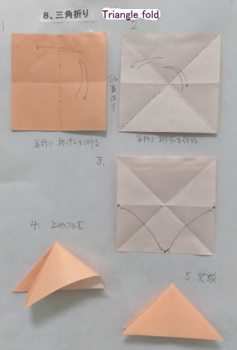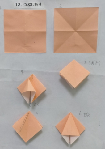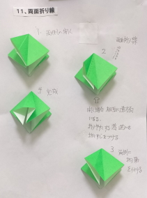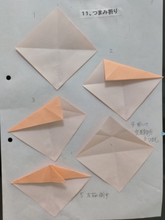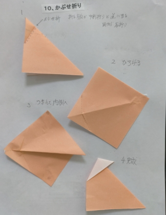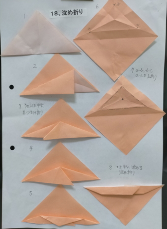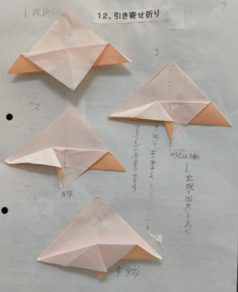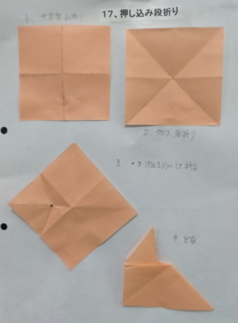 3、各回1−2個の折り図を見ながら基本の折り方の使われ方を確認しつつ折ってゆく